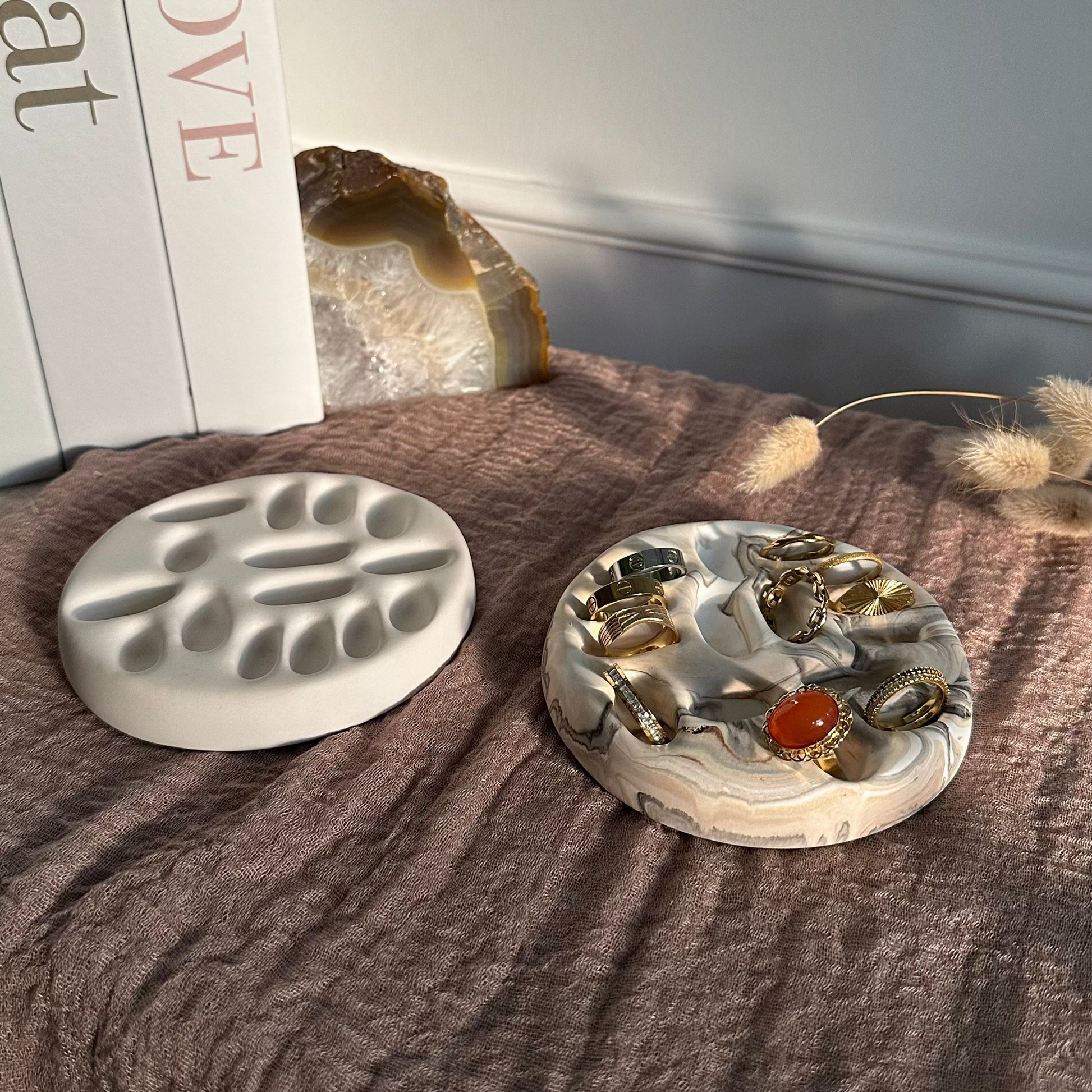 „Heimathafen“ ist ideal, um Ringe, kleine Ohrstecker oder filigrane Schmuckstücke stilvoll aufzubewahren. Ob auf dem Nachttisch, im Badezimmer oder als dekoratives Element auf dem Schminktisch – die Schale sorgt für Ordnung und setzt gleichzeitig einen sanften Akzent.