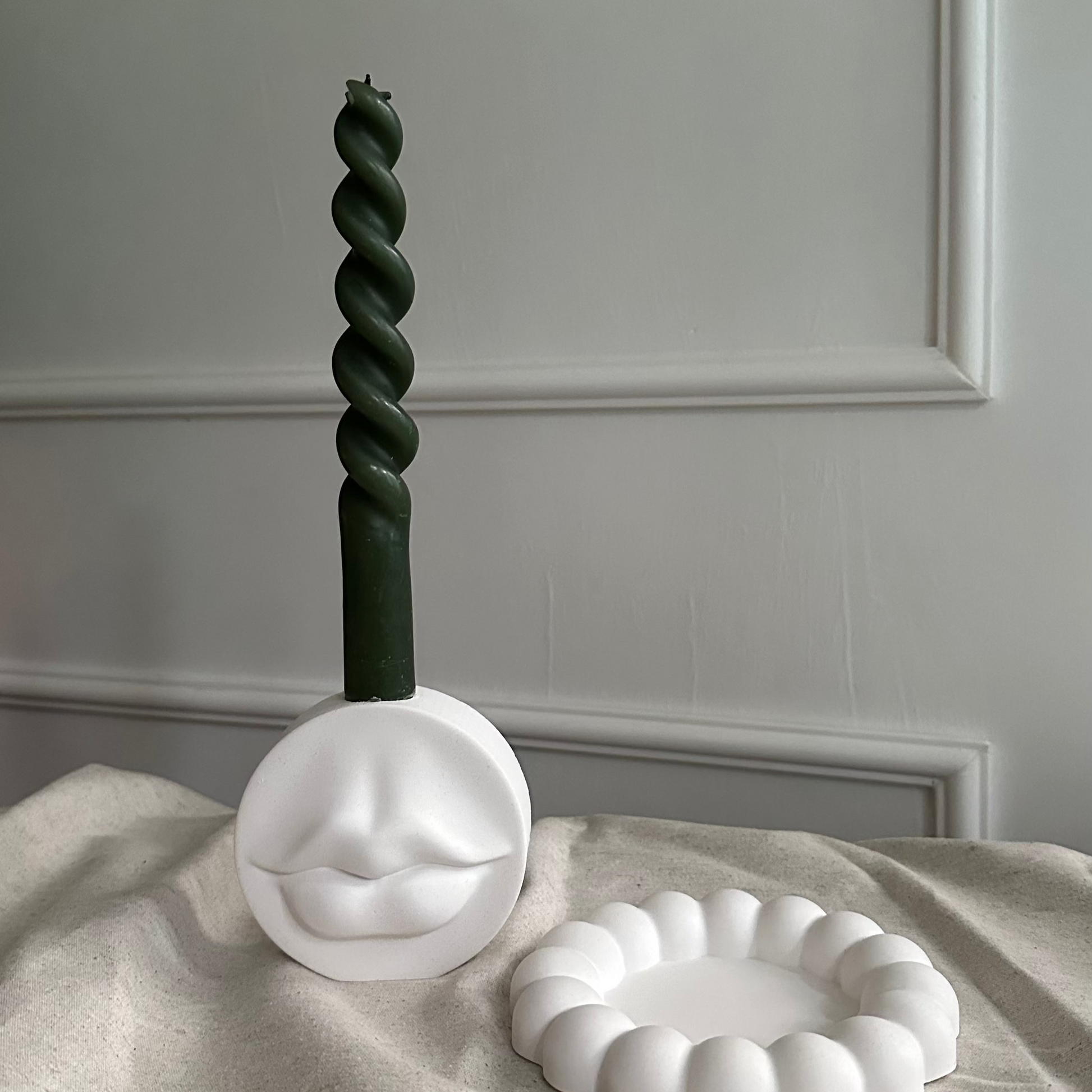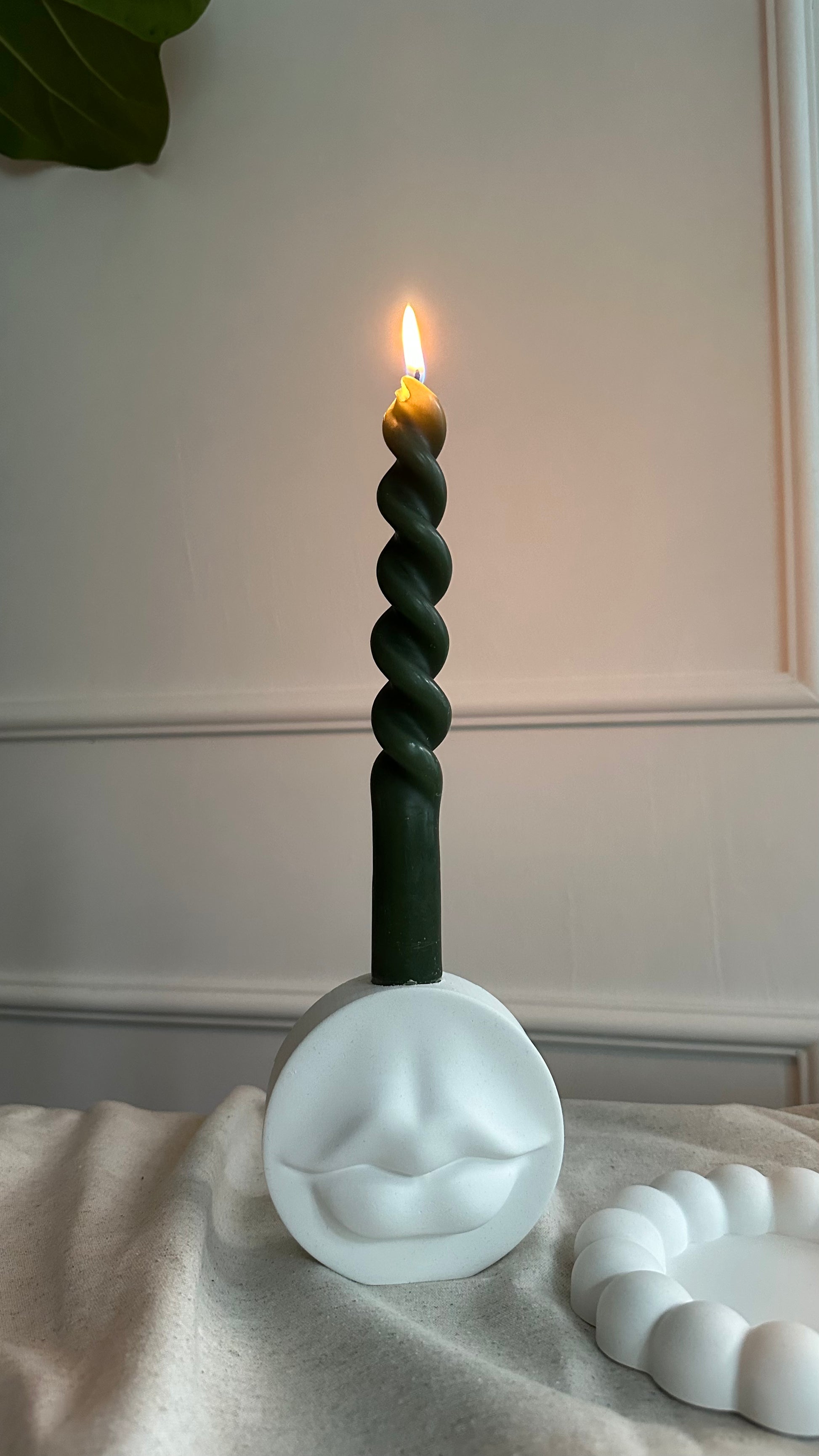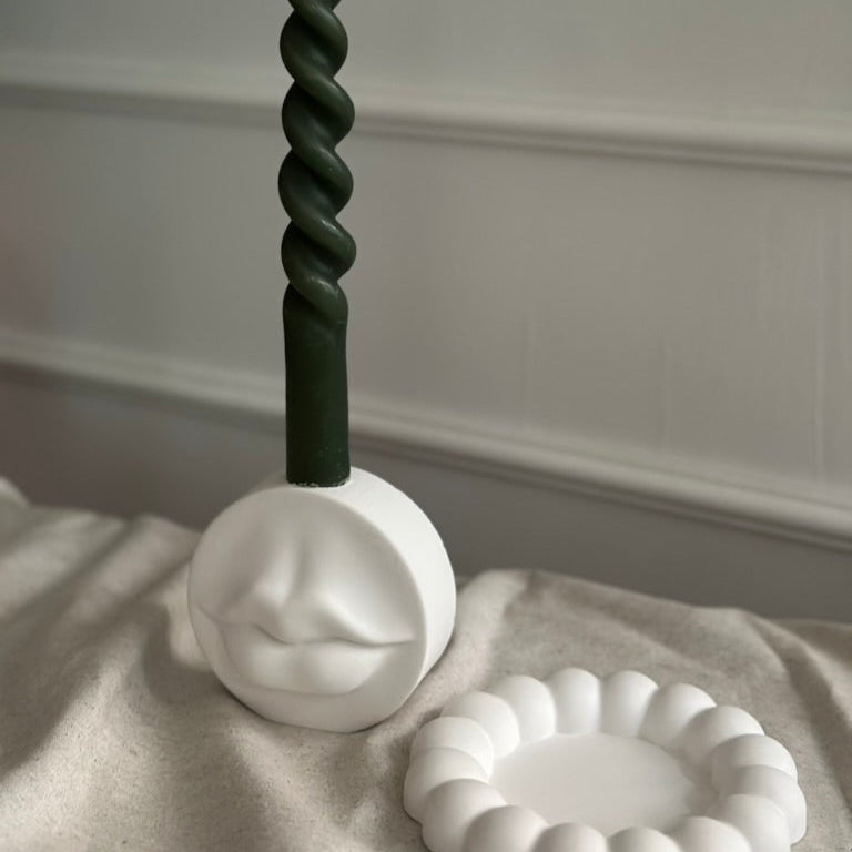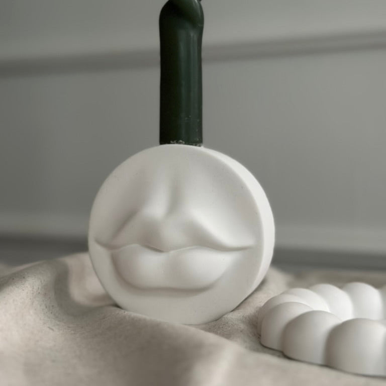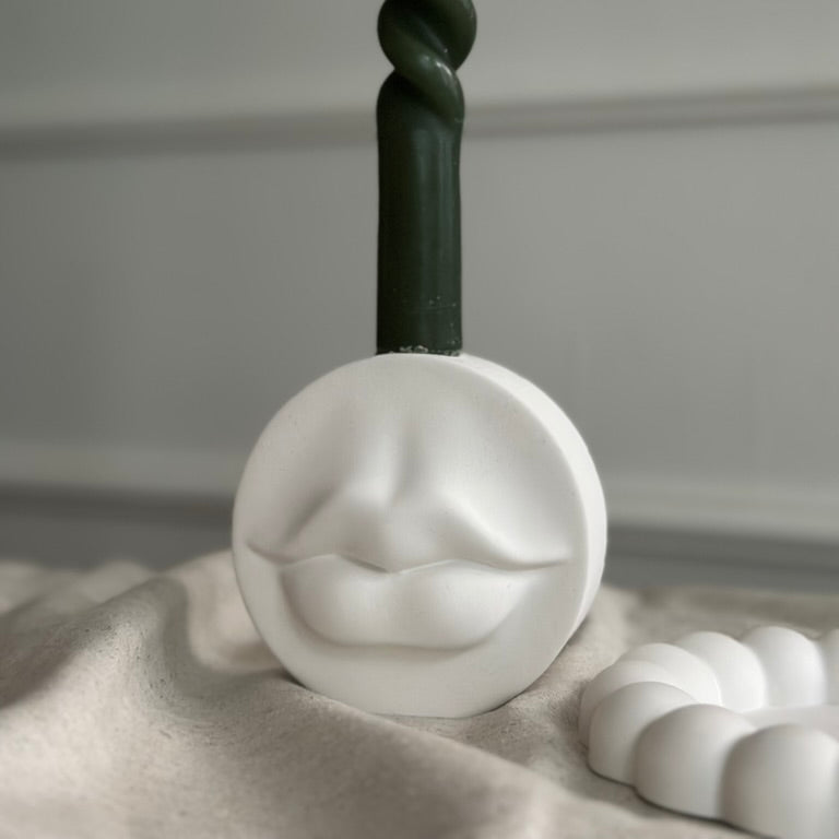 Sinnlich, verspielt und modern – der Kerzenständer „Küstenkuss“ verbindet klare Form mit einem besonderen Detail. Die runde, massive Basis hält Stabkerzen sicher, während der sanft herausgearbeitete Kussmund an der Vorderseite zum dekorativen Blickfang wird.